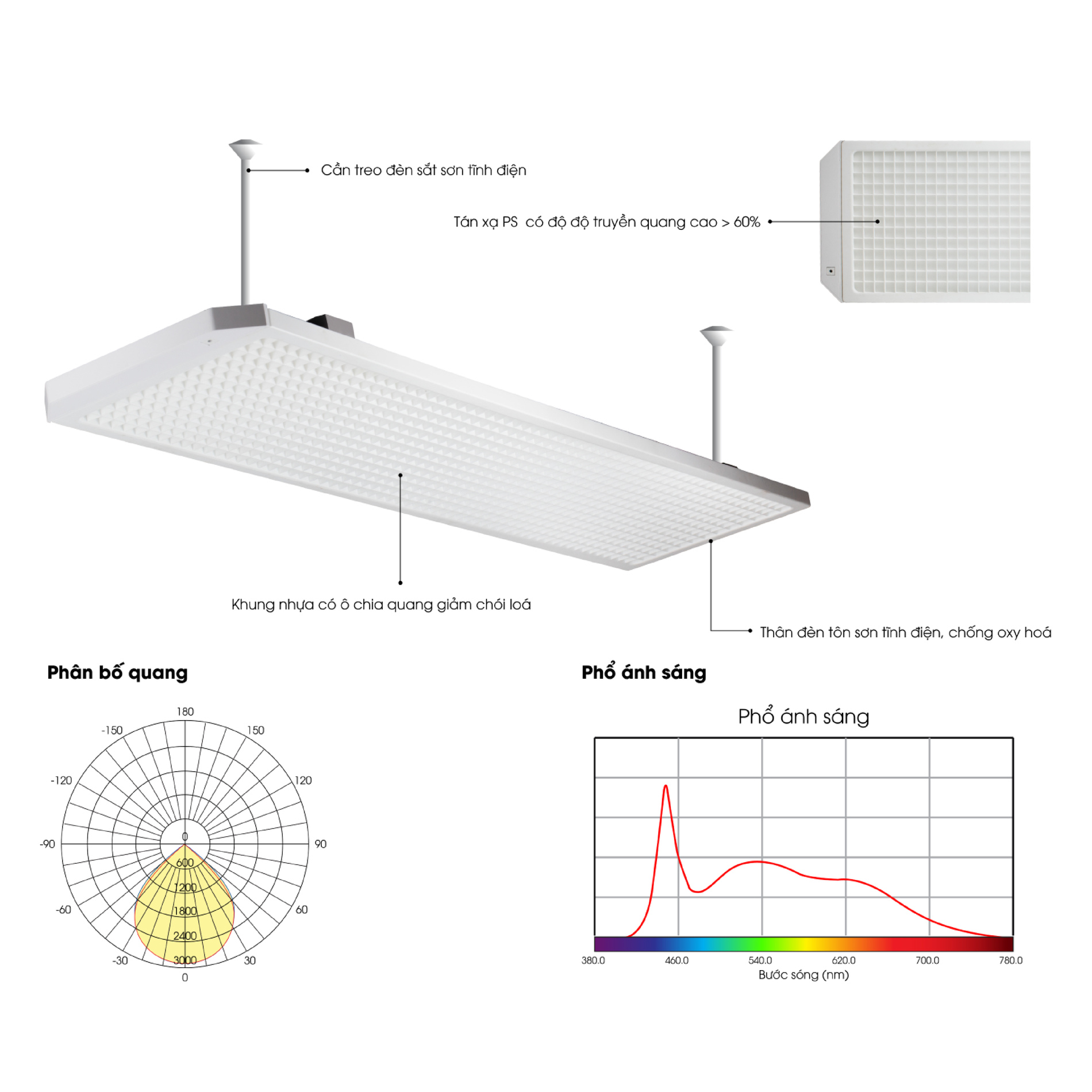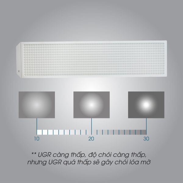 • Khung nhựa có ô chia quang chống chói lóa chỉ số UGR ≤ 16 giúp mắt không bị chói lóa khi nhìn vào vật thể xung quang trong thời gian dài liên tục.